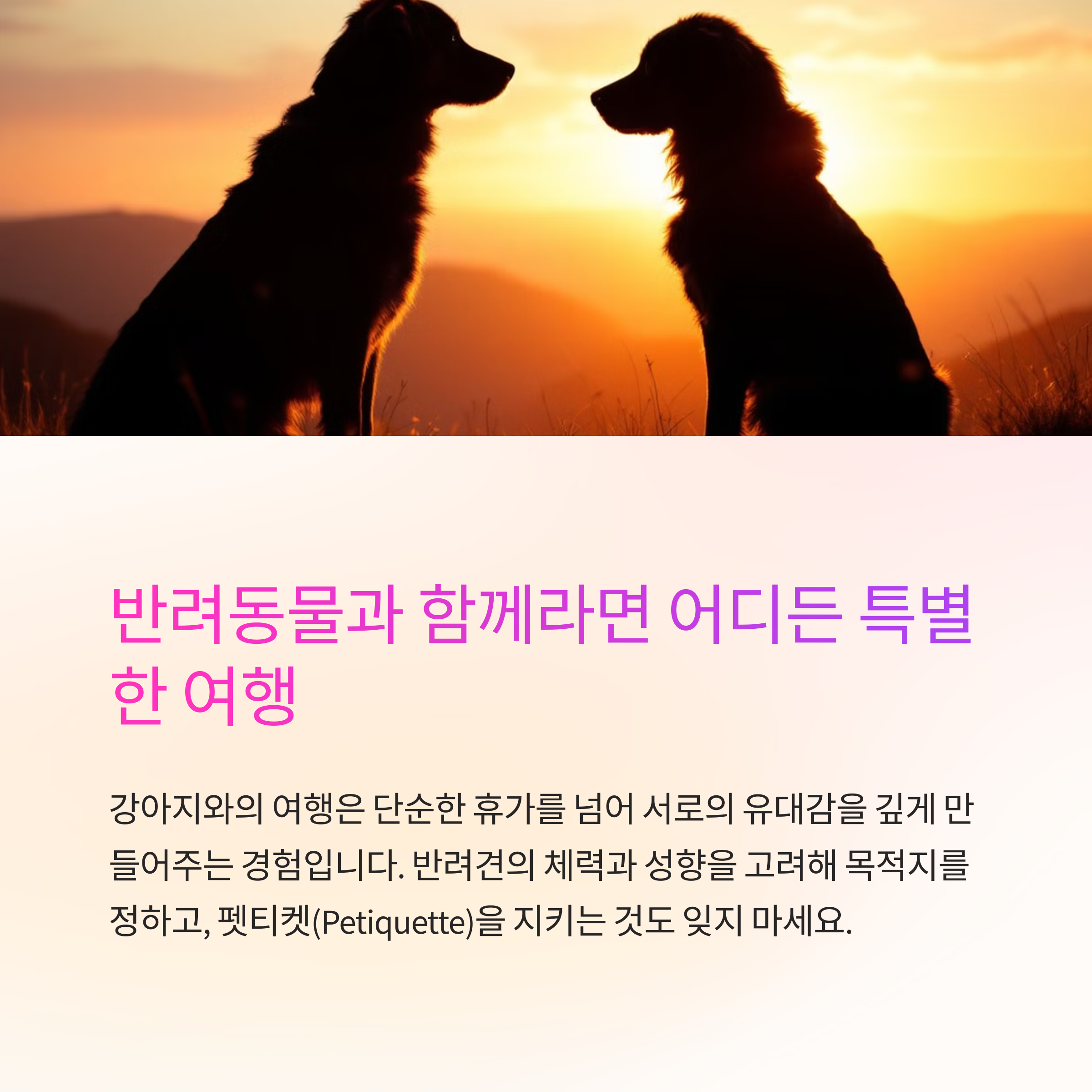 여행을 계획할 때는 반려견의 체력과 성향을 고려해 목적지를 정하고, 출입이 가능한 공간 여부와 기본적인 편의시설 등을 사전에 확인하는 것이 중요합니다. 또한, 다른 여행객을 배려하는 펫티켓(Petiquette)을 지키는 것도 잊지 마세요.