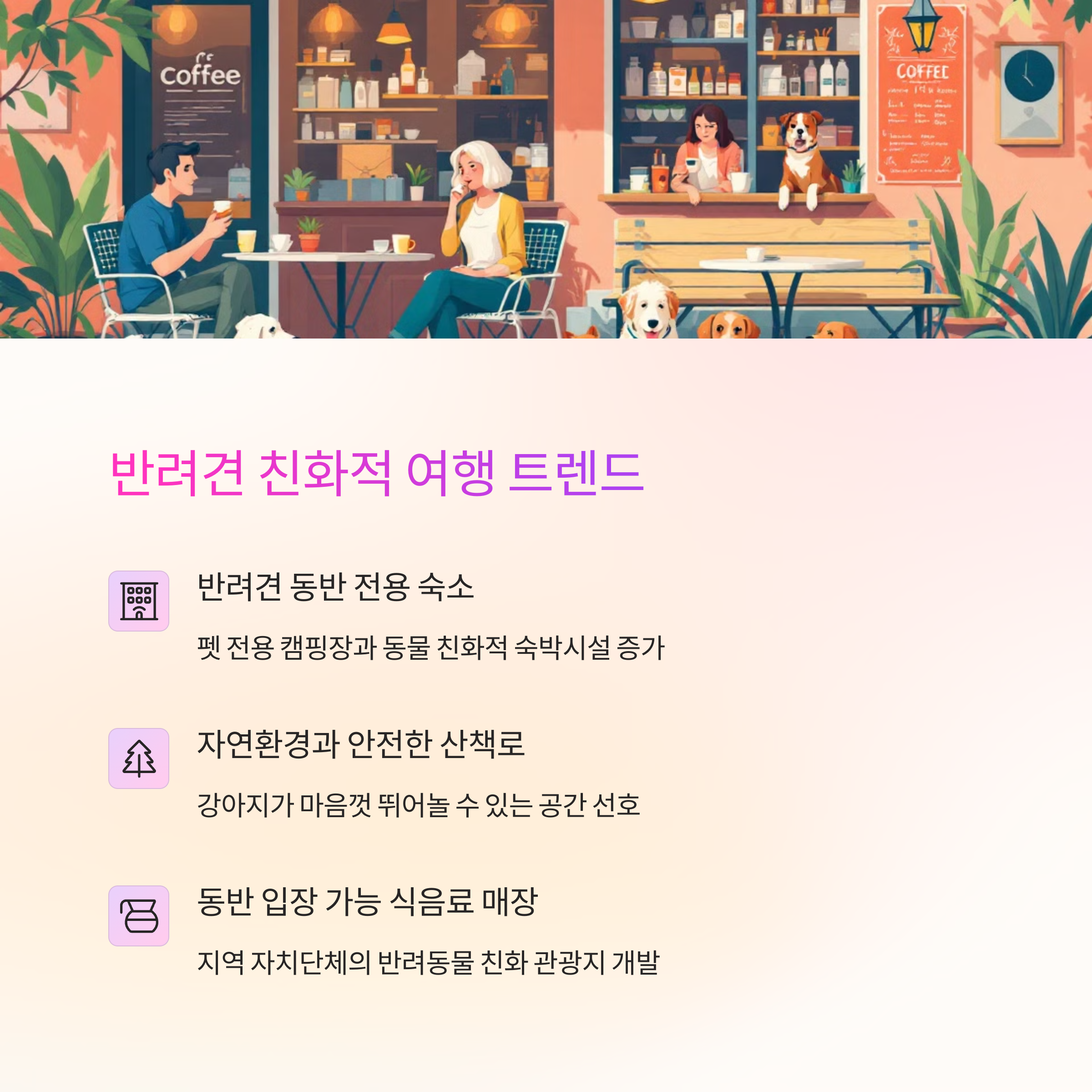 이러한 흐름에 따라 최근에는 반려견 동반 전용 숙소, 펫 전용 캠핑장, 동물 친화적 관광지 등 다양한 옵션이 생겨나고 있으며, 지역 자치단체에서도 반려동물 친화 관광지 개발에 힘을 쏟고 있습니다. 특히 강아지가 마음껏 뛰어놀 수 있는 자연환경과 안전한 산책로, 동반 입장이 가능한 식음료 매장이 있는 장소는 펫팸족들에게 가장 큰 관심을 받고 있습니다.
